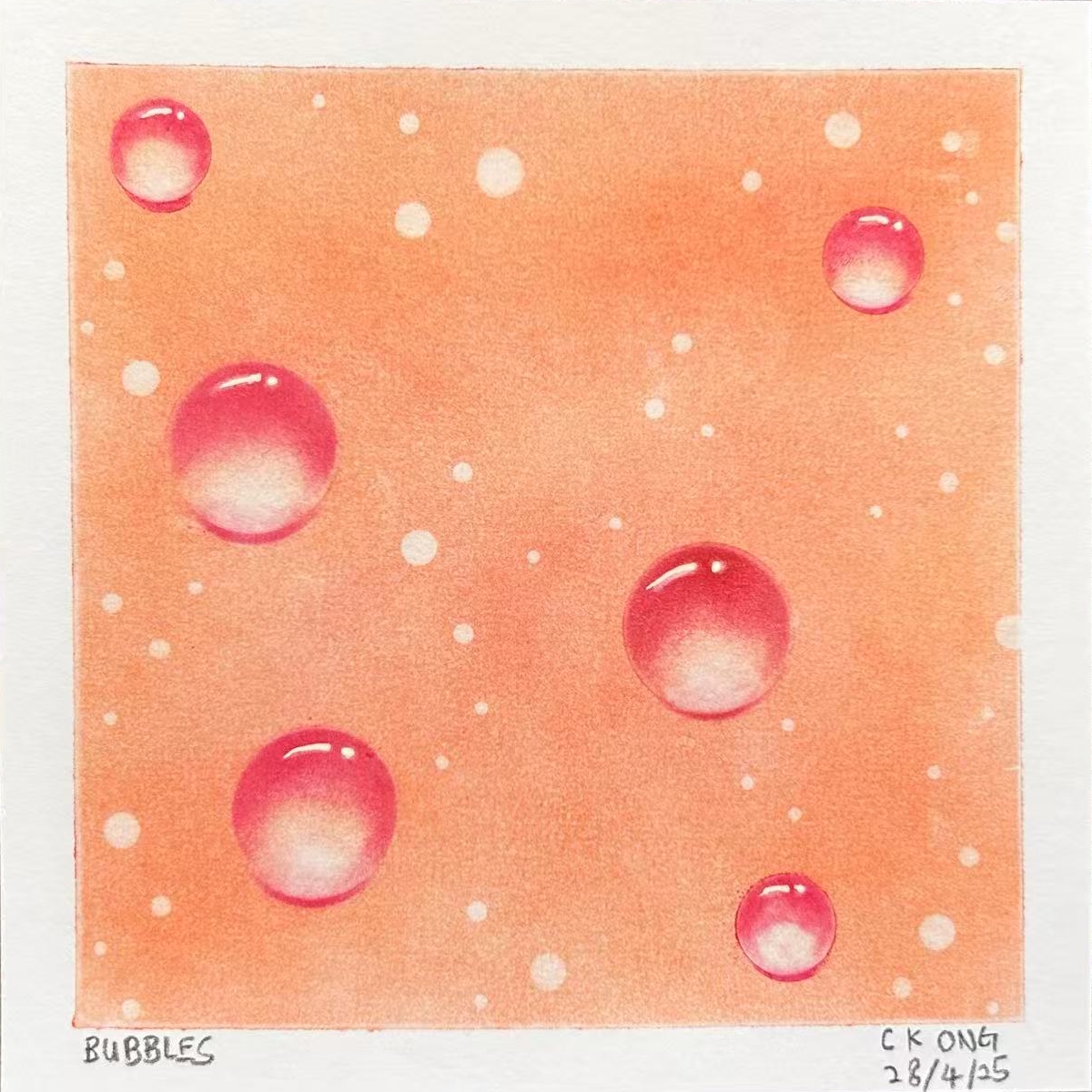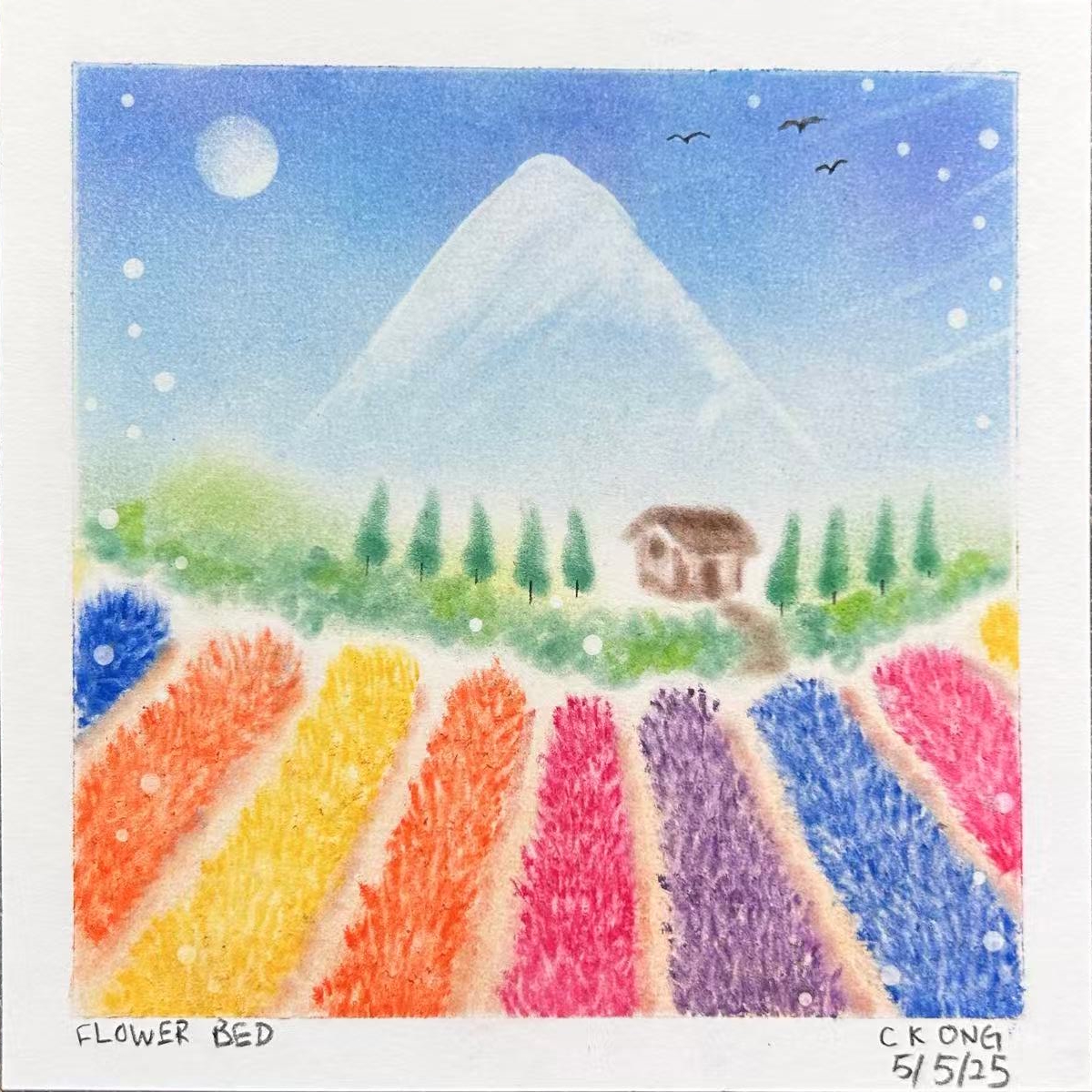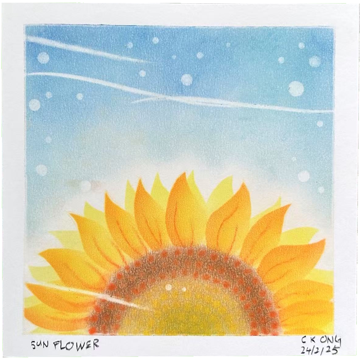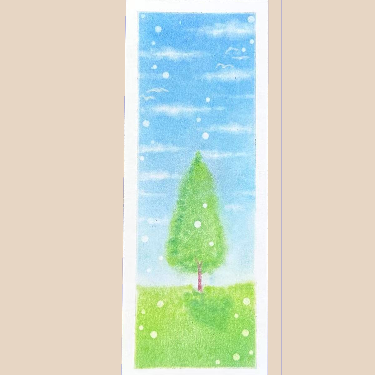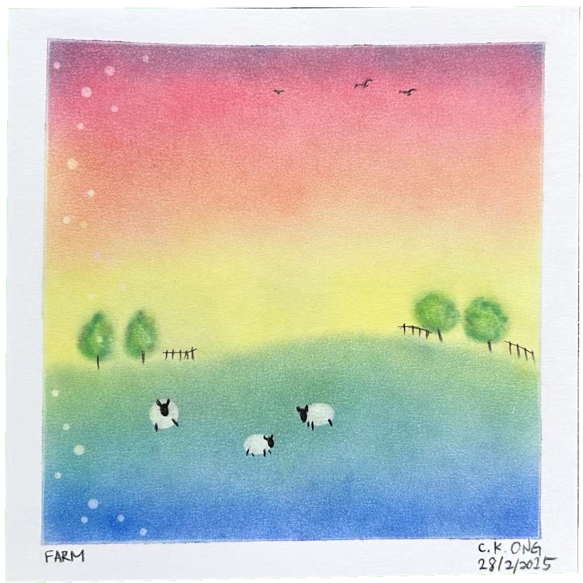 The artwork used fingers to apply pastel color on Nagomi paper. In this artwork, I learnt to color a white base to the art paper, and then cover the white base with blue pastel to create a blue background. For the hills, I created my own curve-shape stencil to draw the outline of the hills, and applied yellow pastel over the blue based to create the green lands. I also learnt to use oval-shape stencils to erase the background color to show the white base to form the body of the sheeps, and then used charcoal pencil to draw the heads and legs of the sheeps. The circle bubbles were created by erasing the background color to give the white base with circle-shape stencils. I surprised to see the white bubbles give dreamy effect to the artwork. I am amazed that simple tools can be made to create such a nice artwork for my first try on Pastel Nagomi.